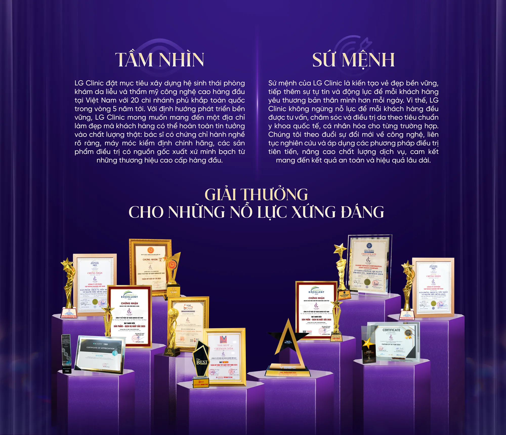 Là đối tác chiến lược của hơn 20 tập đoàn thiết bị, thẩm mỹ y tế hàng đầu và hợp tác cùng hơn 30 thương hiệu dược mỹ phẩm danh tiếng toàn cầu, LG Clinic không ngừng nâng tầm năng lực chuyên môn và chuẩn hóa trải nghiệm dịch vụ thẩm mỹ, chăm sóc, điều trị da công nghệ cao. LG Clinic có cơ sở vật chất thuộc top đầu TPHCM, được đầu tư bài bản về thiết kế, trang thiết bị và công nghệ điều trị – thể hiện đúng tinh thần của một thương hiệu thẩm mỹ cao cấp, trải nghiệm khác biệt.